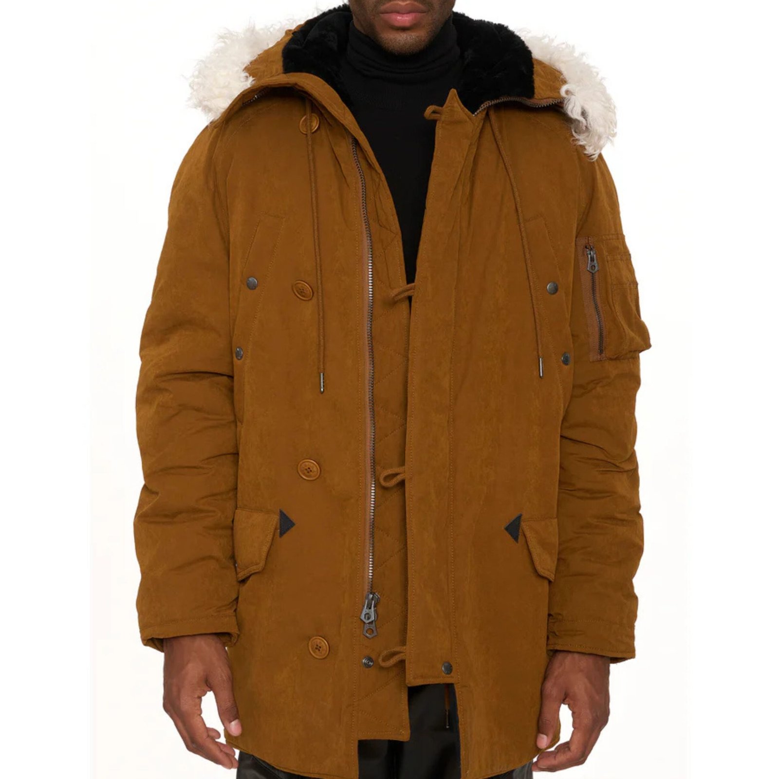 The N-3B’s outer shell is crafted from tough, weather-resistant nylon that sheds wind, sleet, and light snow, while a dense, quilted insulation traps heat without excess bulk. A full-length storm flap guards the two-way front zipper to lock out drafts, and the high stand collar seals securely under the removable, faux-fur-trimmed snorkel hood. Pull the hood forward and you’ll appreciate its extended profile—purpose-built to shield your face from biting wind.