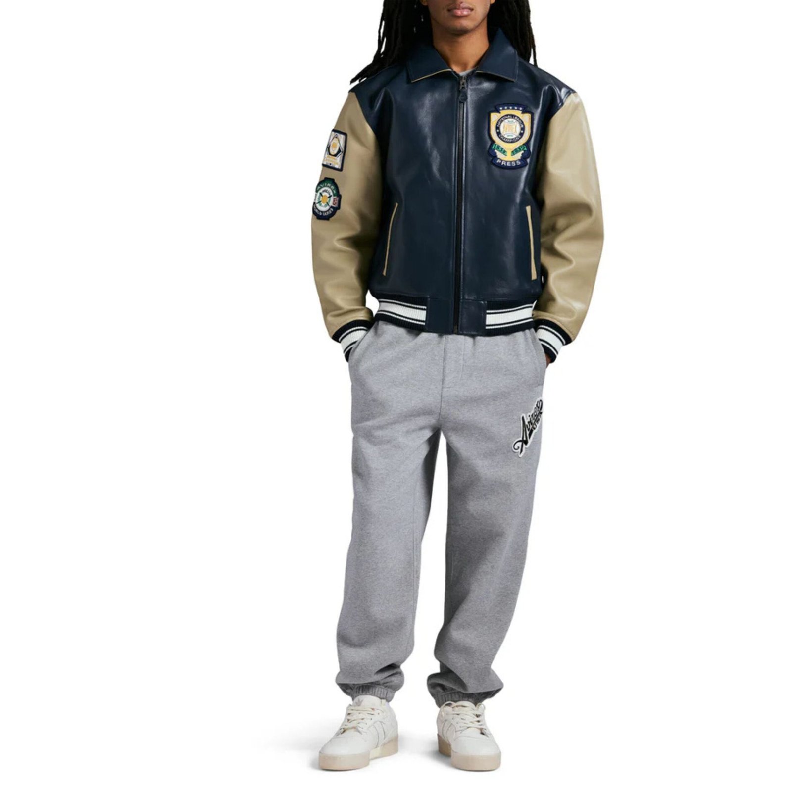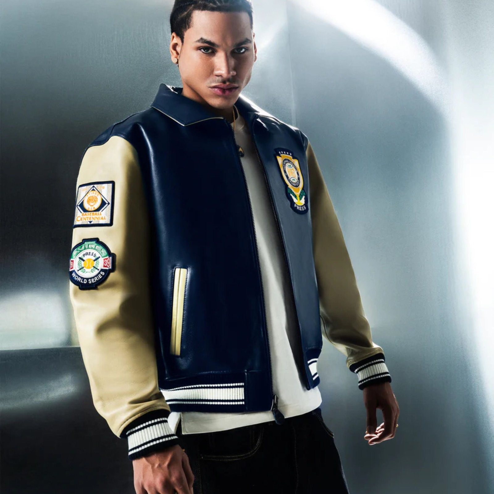 The body of the jacket is crafted from high-quality wool, providing warmth, structure, and a timeless varsity appeal. Contrasting sleeves are made from supple, durable leather, offering both style and mobility. This combination creates a bold, polished look that is both versatile and eye-catching. A quilted interior lining ensures all-day comfort, while allowing for easy layering over hoodies, shirts, or casual attire.