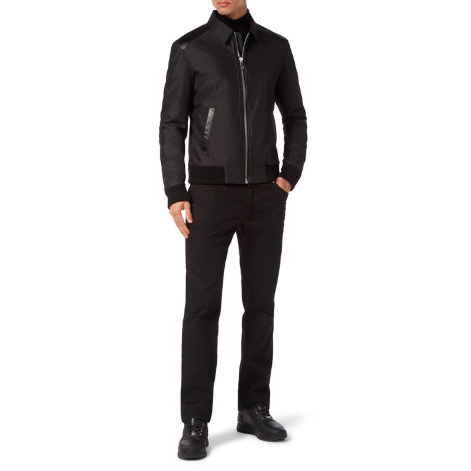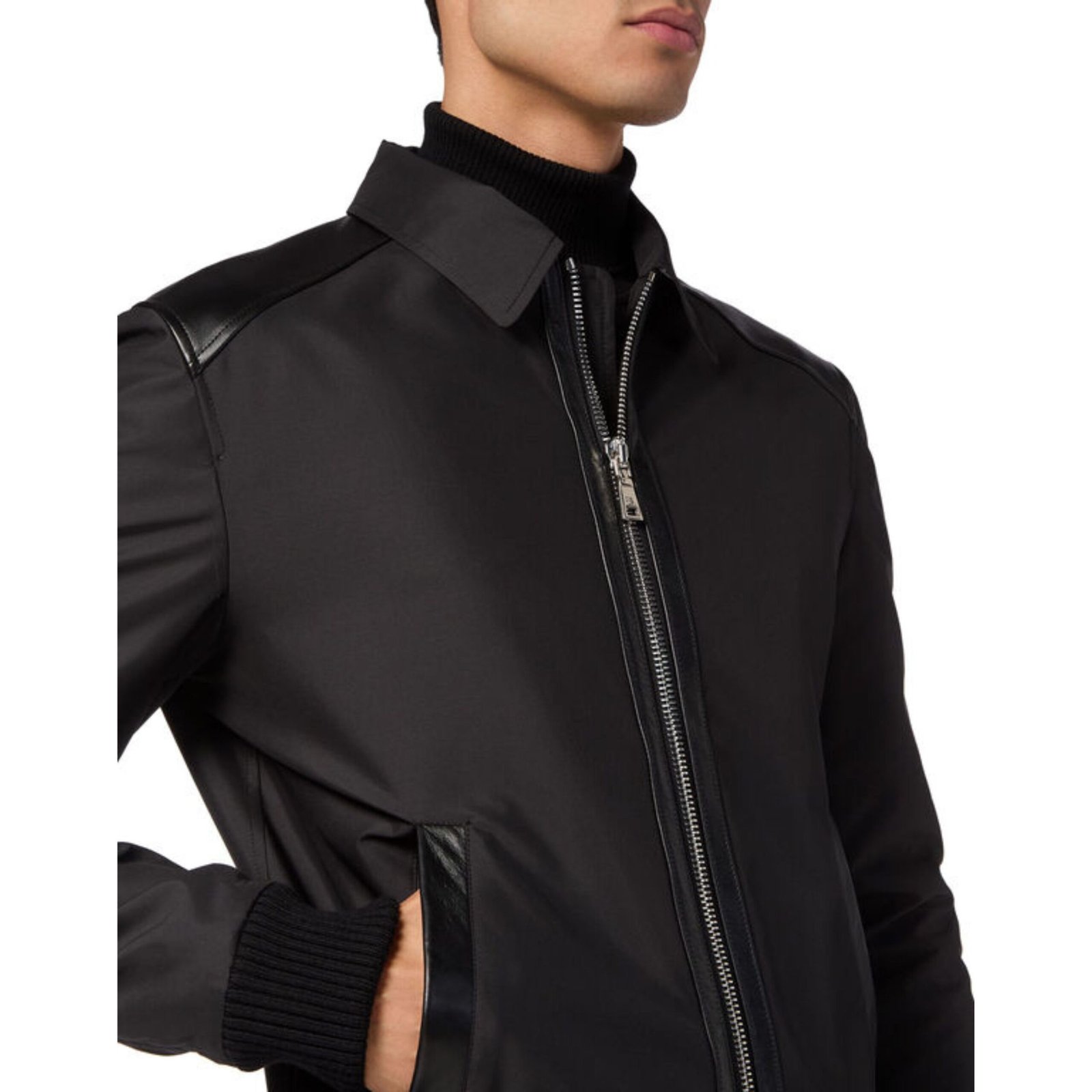 Crafted primarily from durable nylon, the jacket provides lightweight protection while maintaining a clean, contemporary aesthetic. Subtle leather details enhance its design, adding texture and refinement without overwhelming the streamlined look. A shirt-style collar introduces structure and a tailored edge to the otherwise relaxed bomber silhouette, bridging the gap between casual and refined styling.
