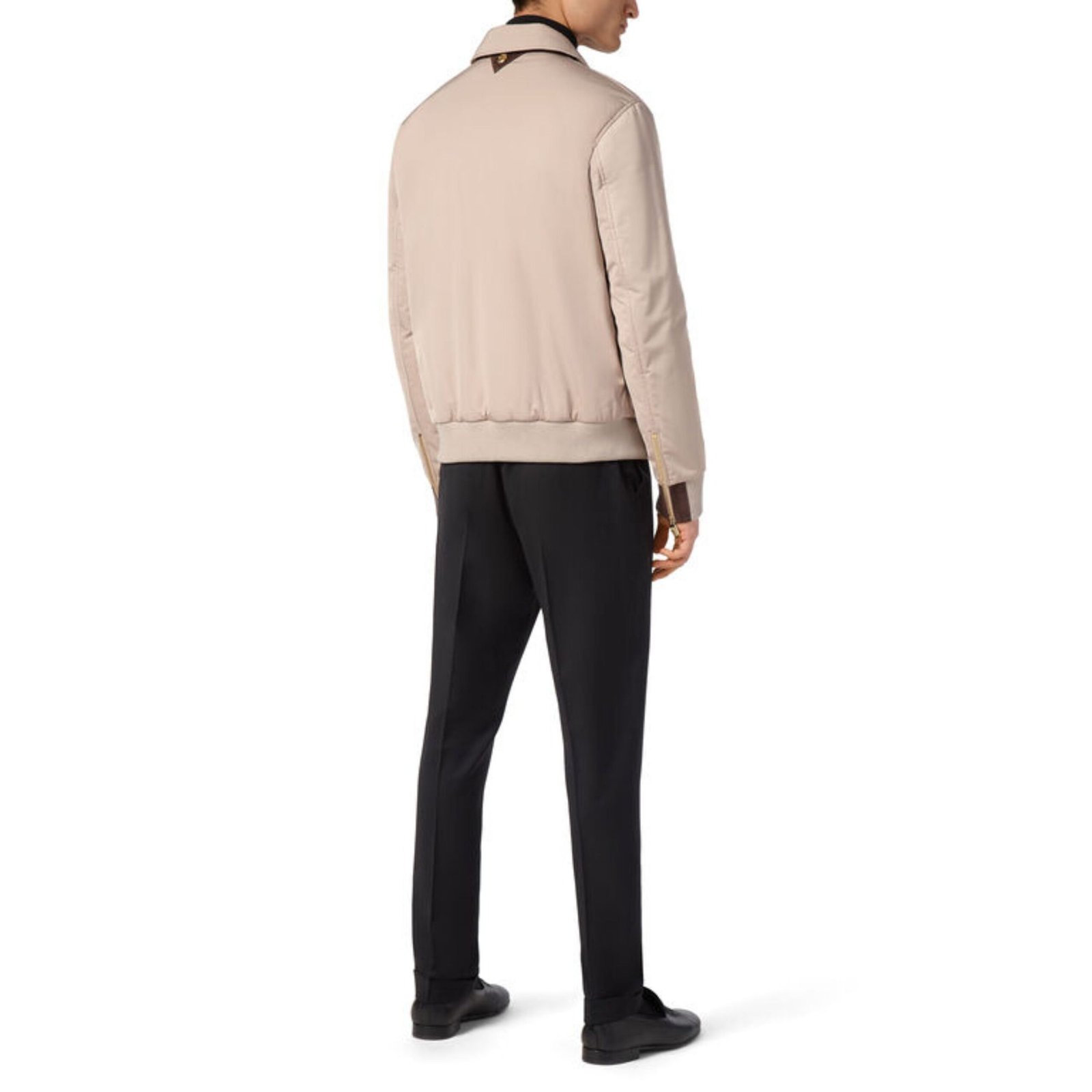 With its high-quality materials, meticulous detailing, and practical design, this nylon and leather bomber jacket is more than just outerwear—it’s a statement of modern elegance, proving that sporty style can be effortlessly chic and unmistakably luxurious.