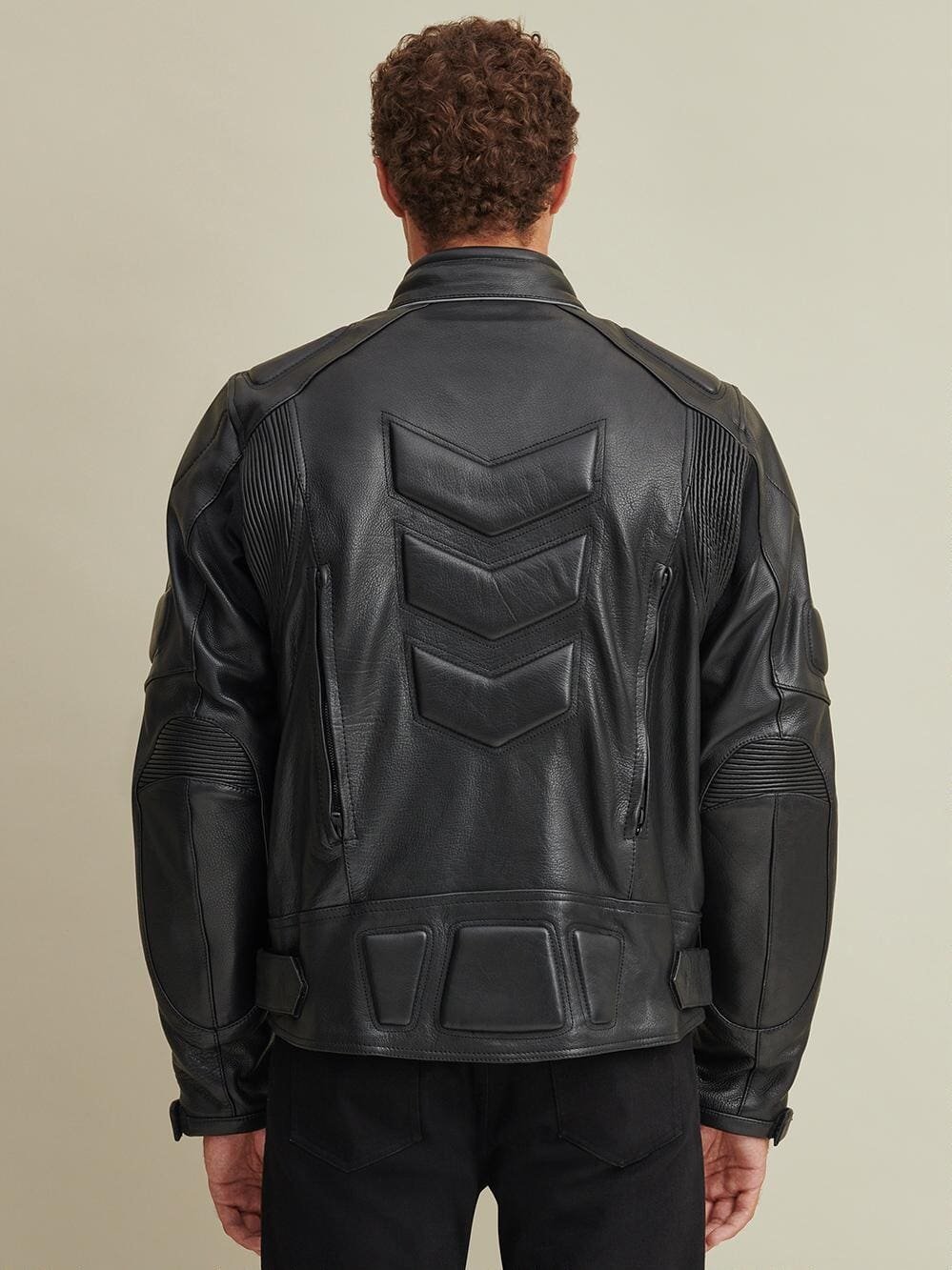 Chevron-style upper back padding; lower back padding; dual-zip rear vents on seams.