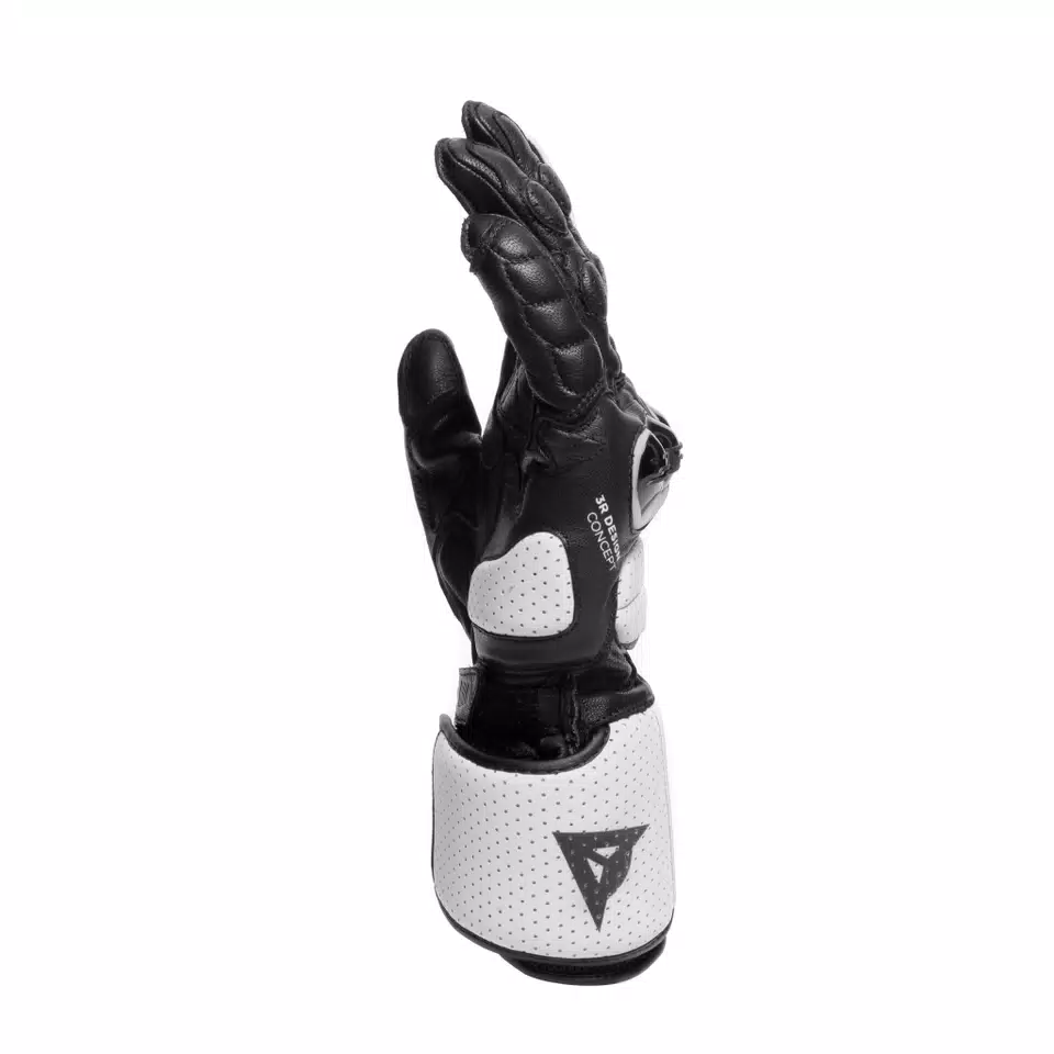 Touchscreen-compatible fingertips on the index finger allow riders to operate smartphones or GPS systems without removing the gloves. The overall design is sleek and sporty, with subtle Dainese branding and a fit that mirrors the contours of the rider’s hand for maximum control and comfort.