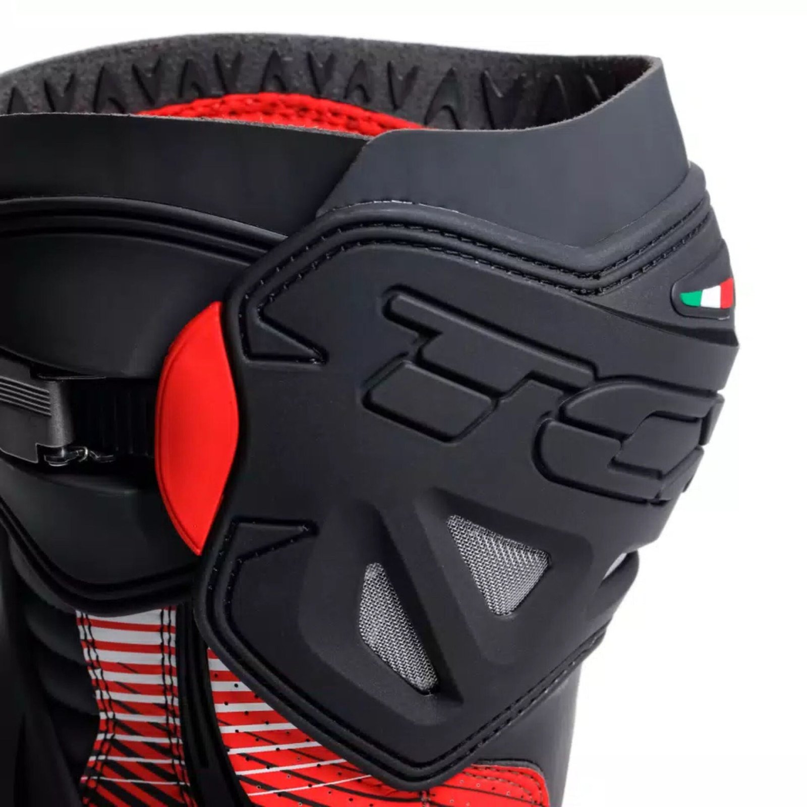The Dainese RT-Race Pro Air motorcycle Racing boots Blackredwhite are the flagship racing model, developed in collaboration with professional MotoGP™ riders and the TCX R\&D team. Built for elite performance on the track, these boots combine cutting-edge protection, precision fit, and superior ventilation for intense racing conditions.