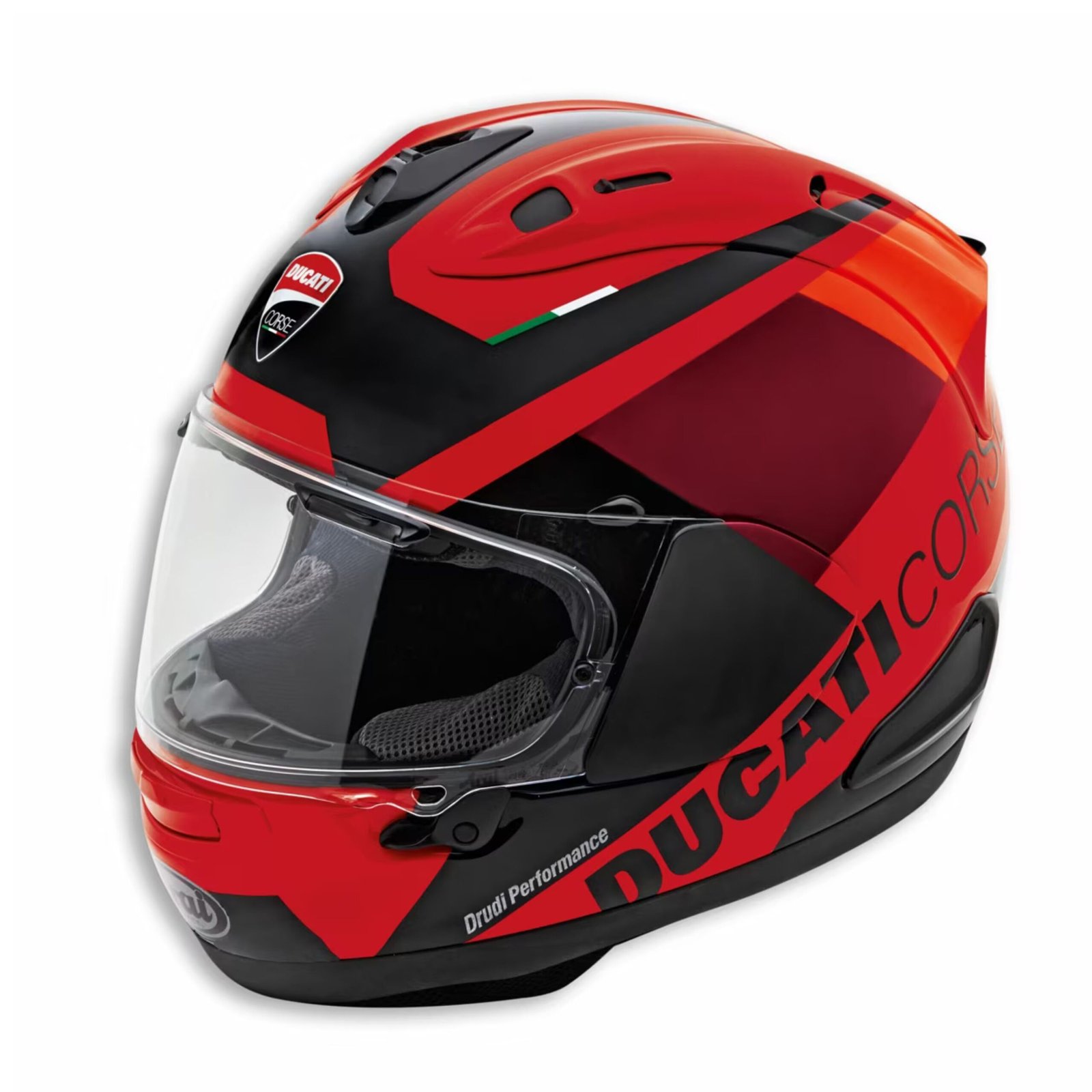The Ducati Corse V6 Helmet – MotoGP-Inspired Excellence The Ducati Corse V6 helmet, born from the prestigious collaboration with Arai, brings together elite design, cutting-edge performance, and unmistakable Ducati style. Drawing inspiration from MotoGP racing graphics, this exclusive model showcases bold Ducati red, balanced with burgundy, fluorescent red, and deep black. The striking chromatic inserts create a refined yet aggressive look, ensuring riders stand out both on the track and the road. Designed by Drudi Performance exclusively for Ducati, the helmet embodies racing DNA while delivering uncompromising safety and comfort.