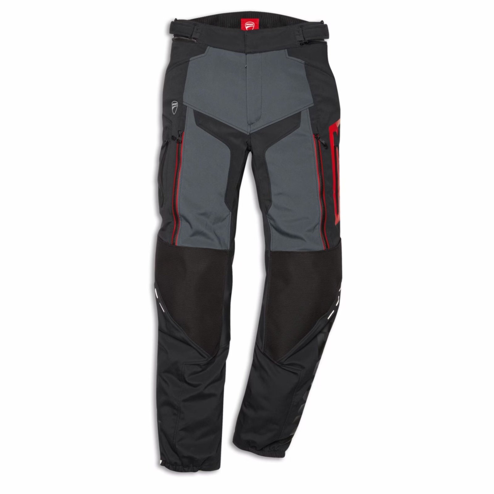 The Ducati Strada C5 Fabric Trousers.Designed for riders who demand both comfort and protection in all weather conditions, these Ducati trousers combine advanced materials, functional features, and a thoughtful ergonomic design. Engineered with 100% waterproof Mugello fabric, the trousers ensure complete protection from rain while remaining breathable and comfortable for extended rides. Elastic inserts on the knees provide enhanced flexibility and freedom of movement, allowing riders to maintain full control whether navigating city streets or leaning into aggressive corners. An adjustable waist fastening and adjustable back width guarantee a personalized and secure fit, adapting to various body types for maximum comfort.