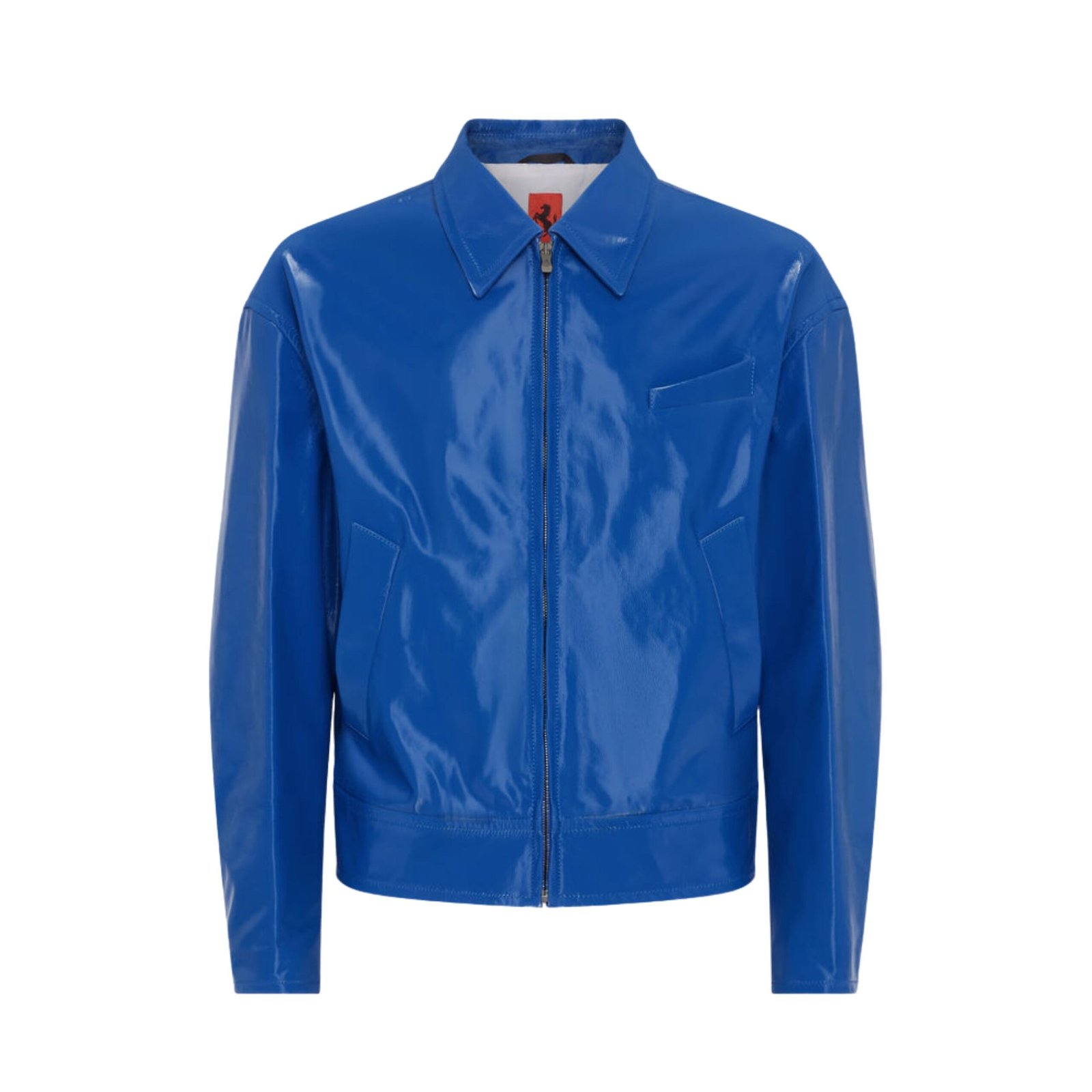 The Ferrari Bomber Jacket In Liquid Leather.A true must-have in the Ferrari wardrobe, this bomber jacket blends classic design with contemporary flair, making it a versatile and distinctive statement piece. Crafted in Italy from premium leather, the jacket is enhanced with a special glossy film coating that intensifies the richness of its surface, creating a vibrant, dynamic play of colour. This finish not only highlights the natural quality of the leather but also lends the garment a modern, polished aesthetic that reflects Ferrari’s innovative spirit.