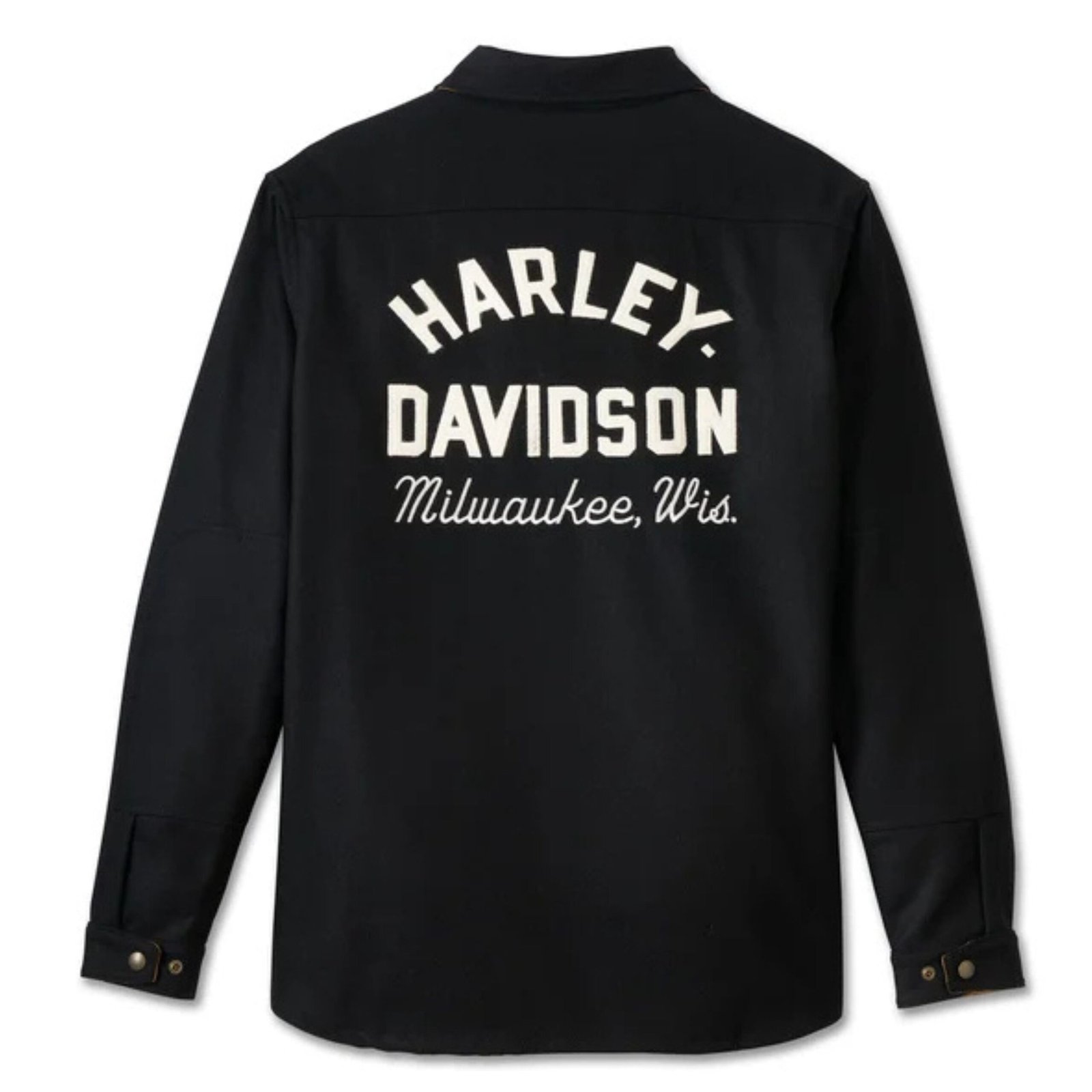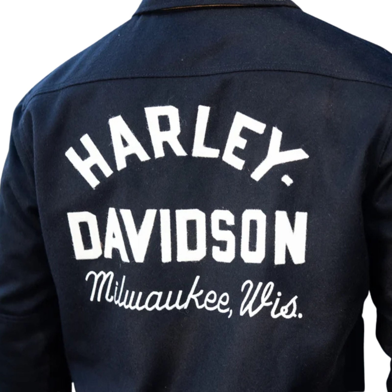 Thoughtful accents elevate the design, including twill fabric detailing under the collar and cuffs, adding a subtle yet distinctive touch. The back is adorned with hand-applied felt lettering, carefully crafted in the iconic arched Harley-Davidson racer font reminiscent of the 1930s and 1940s. This vintage-inspired graphic pays homage to the brand’s rich racing history while offering an authentic, retro look.
