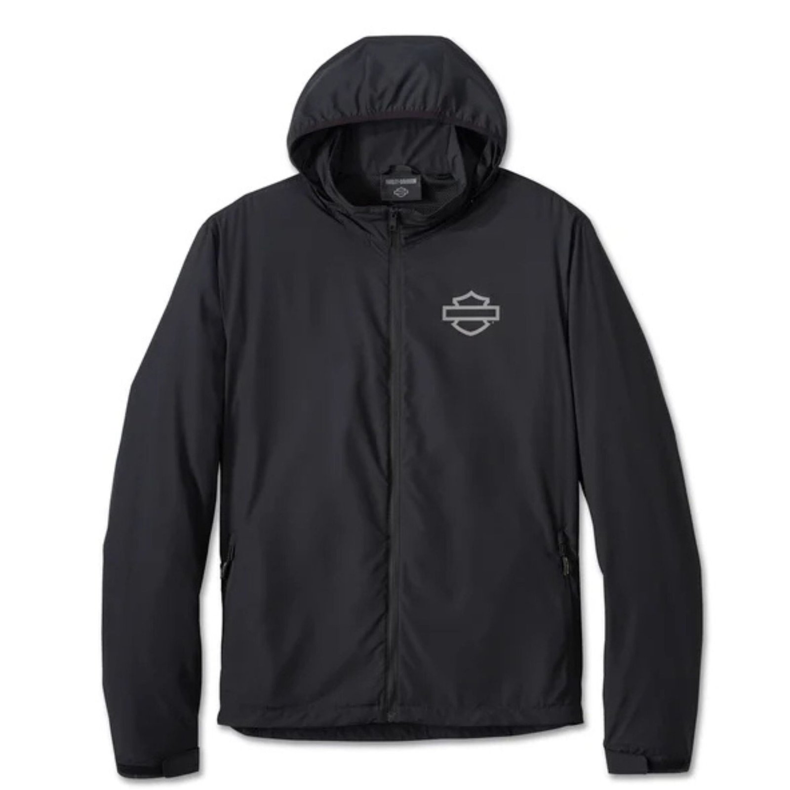 Practicality is built in with multiple secure storage options, including zippered hand-warmer pockets, an interior stash pocket, and an interior zipper pocket. A standout feature is the packable hood, which conveniently tucks away into the interior stash pocket—perfect for long rides, travel, or unpredictable weather conditions.