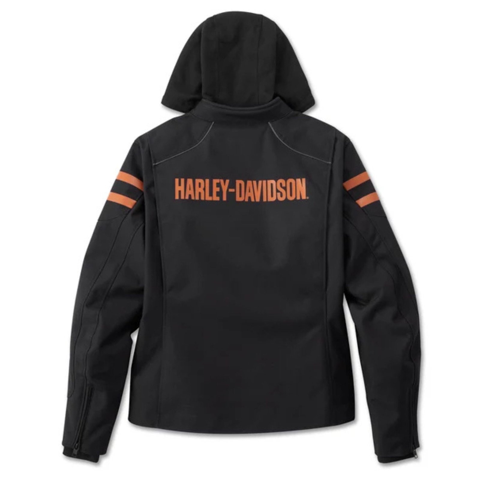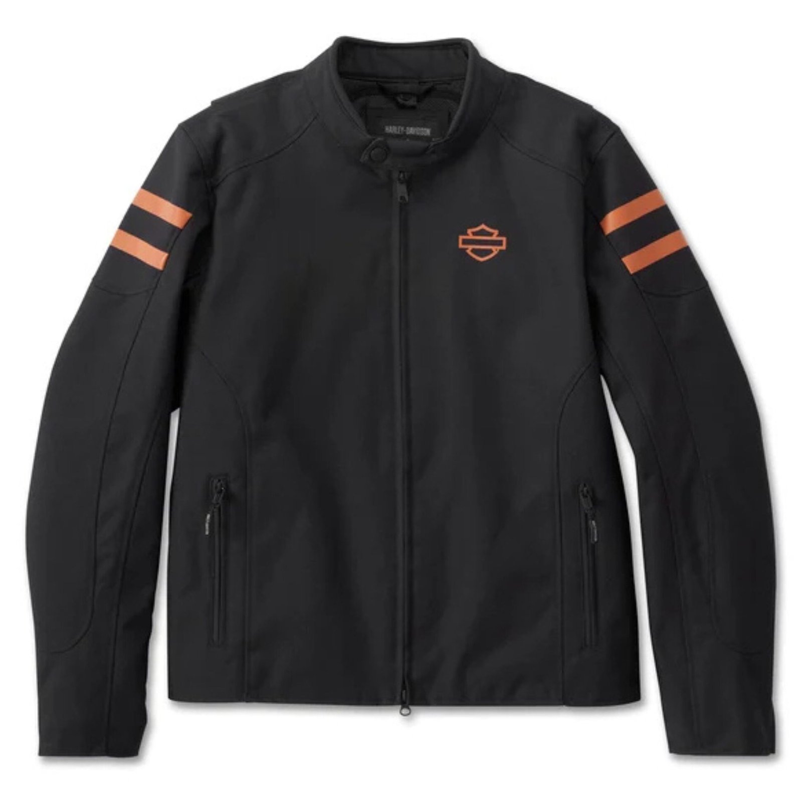 Storage is practical and secure, with welt hand-warmer pockets featuring zipper closures and two interior pockets—one zippered—for essentials. The removable hoodie includes a front zipper, kangaroo pocket, and rib-knit cuffs and waistband for a snug, casual fit. Its minimalist branding allows you to layer it effortlessly with other Harley-Davidson gear.