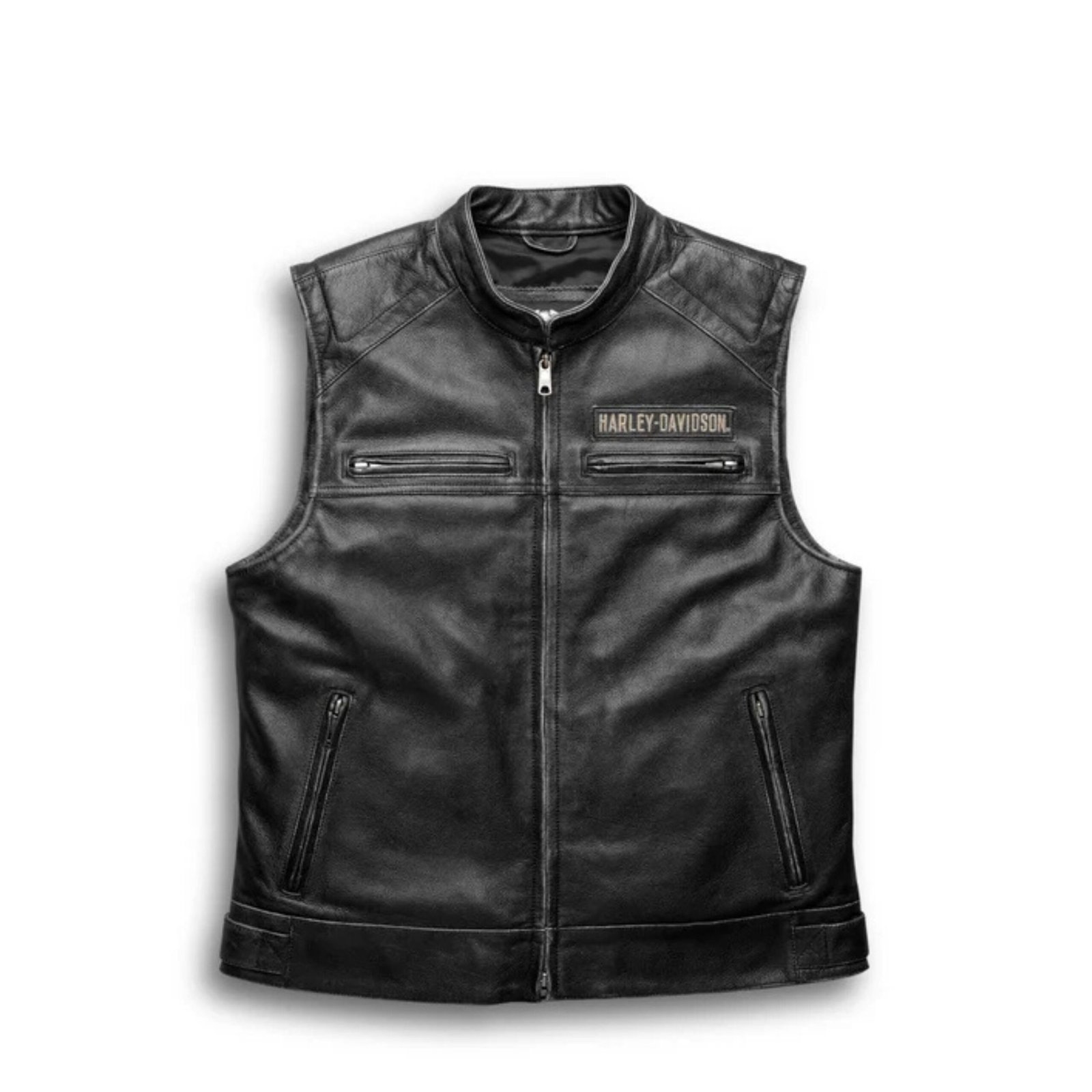 The Harley Davidson Mens Passing Link Leather Vest Davidson® Passing Link Leather Vest is a timeless essential that blends rugged style with standout craftsmanship. Made from premium vintage leather, this vest is built to age beautifully—developing character over time with every mile you ride. Its broken-in look and durable feel make it a piece you’ll reach for again and again, no matter the season.