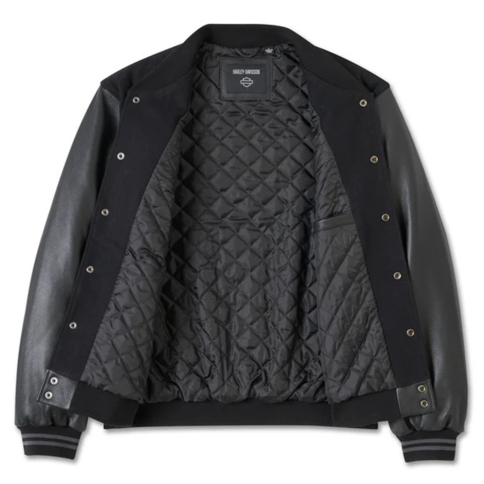 The V-Twin Varsity Leather Jacket brings sporty Harley-Davidson style together with a nostalgic nod to motorcycle heritage. This limited-edition men’s jacket is crafted from a premium blend of wool and polyester for durability and lasting comfort, while midweight cowhide leather sleeves provide added resilience and a refined touch. Light polyfill insulation ensures warmth during cooler rides, making it a practical yet stylish choice for year-round use.