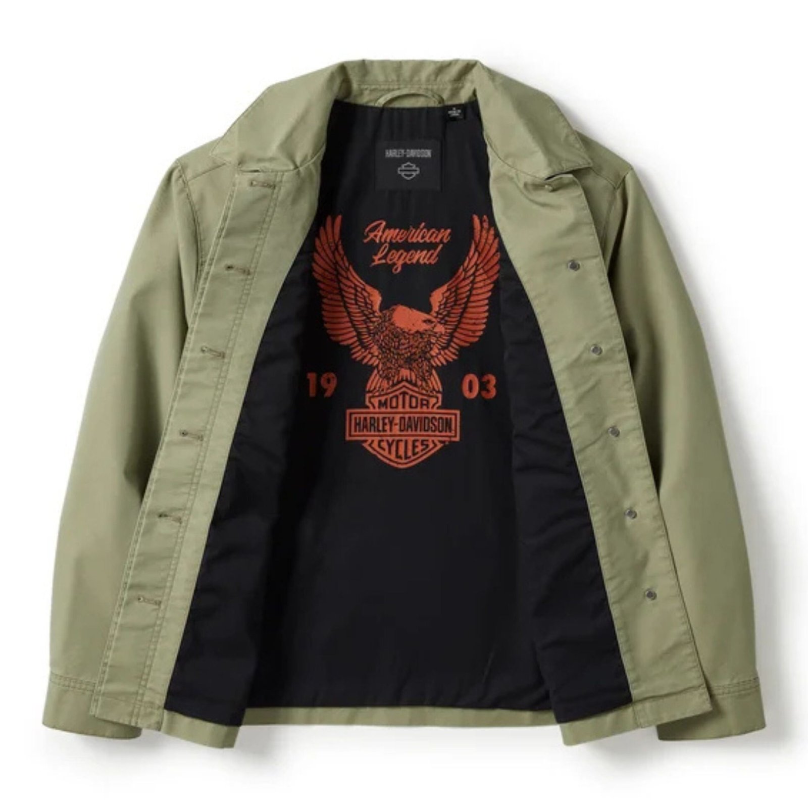 Inside, the contrast lining adds a pop of visual interest, featuring custom artwork in a distressed print that channels a throwback, vintage feel—an elevated detail that sets this piece apart. The exterior is finished with Harley-Davidson’s iconic Bar & Shield logo embroidered on the front and back, adding a bold yet classic touch that reflects your riding heritage with pride.