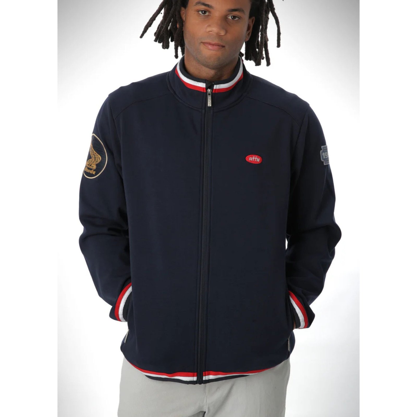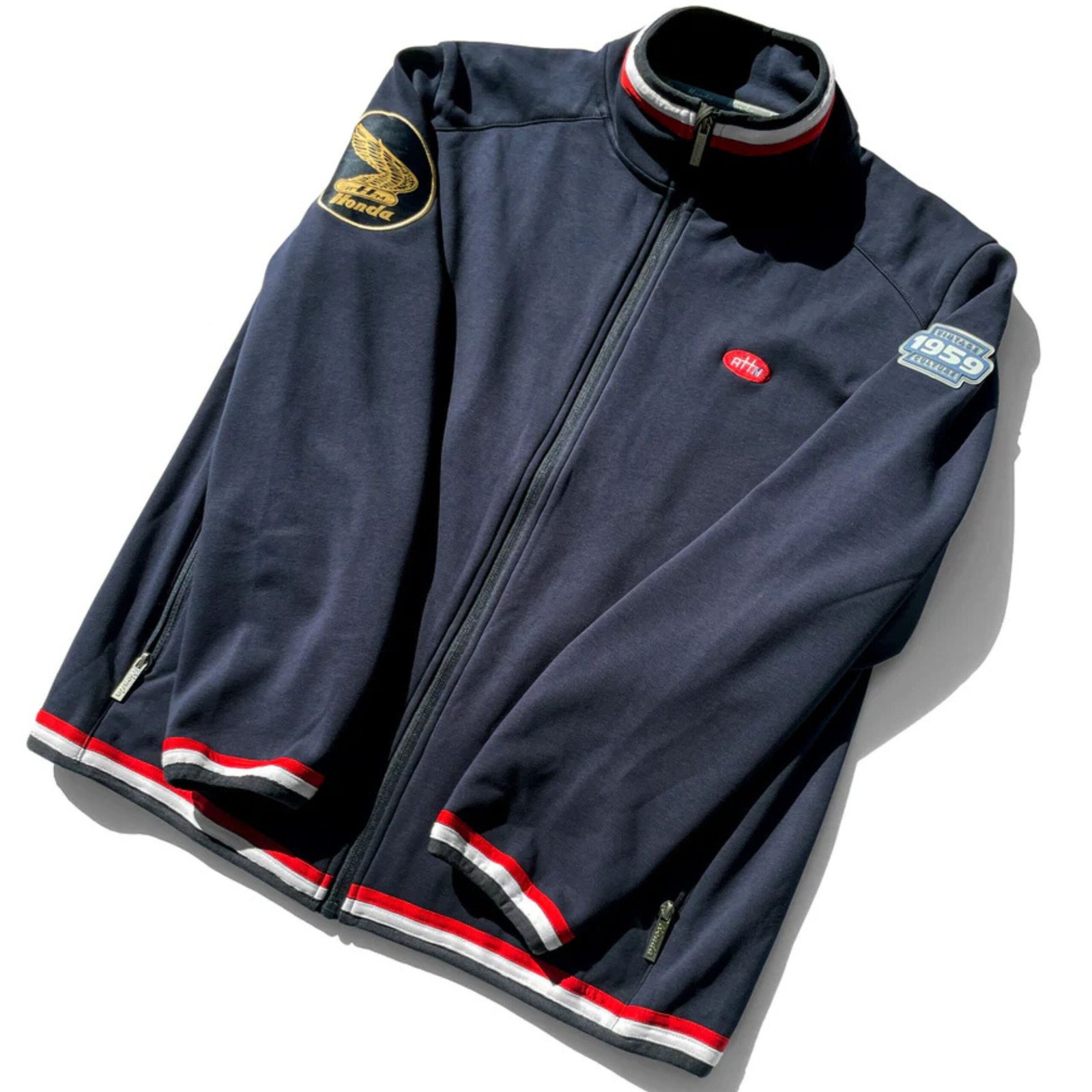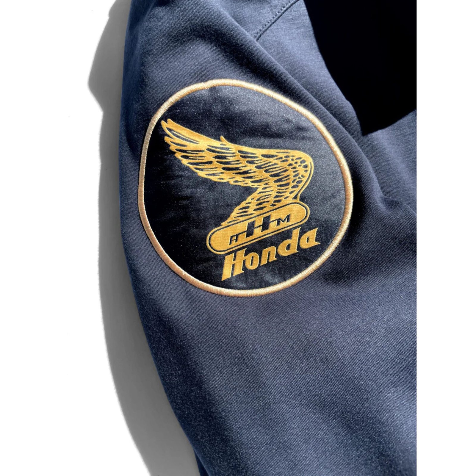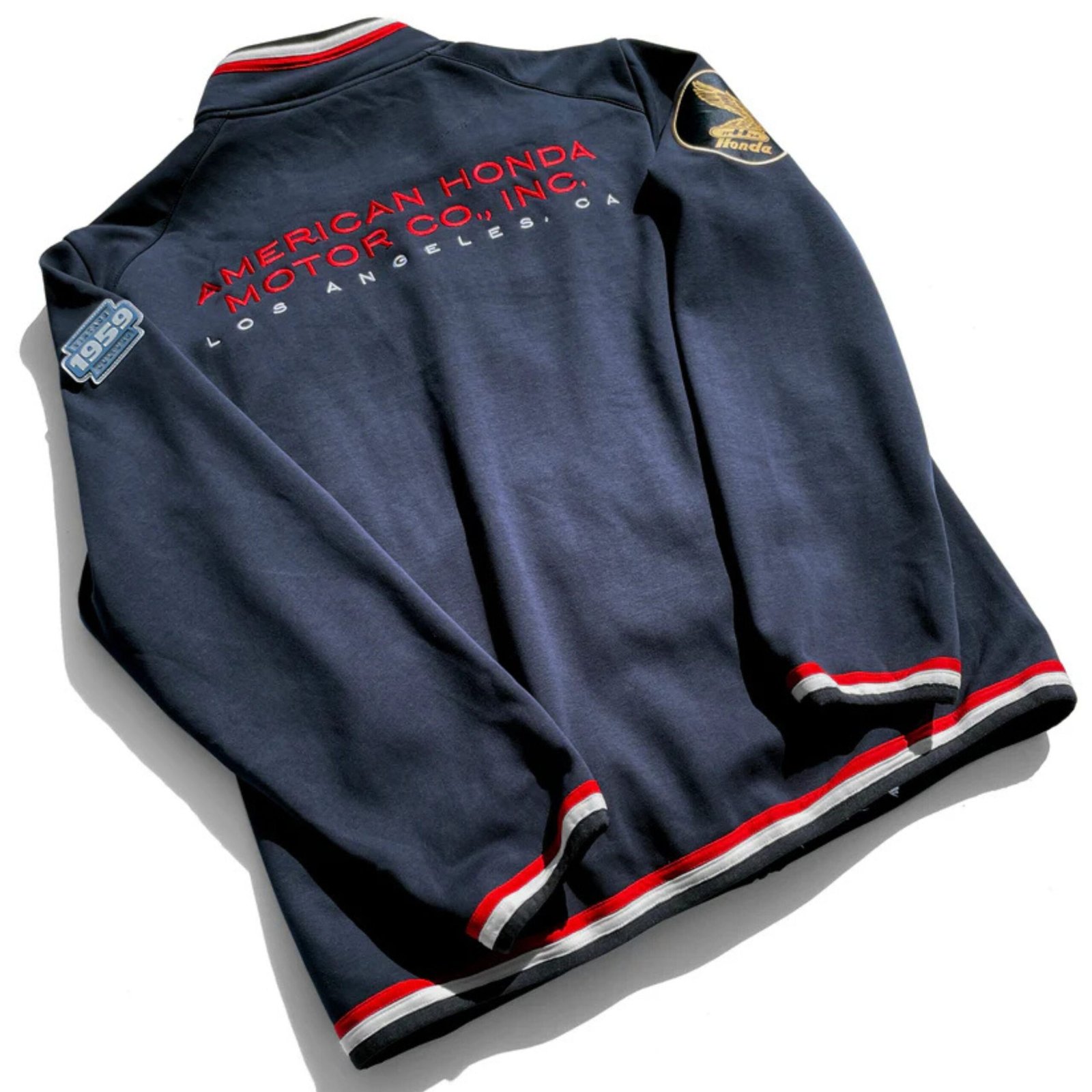 Constructed from a soft-touch fabric blend of 97% polyester and 3% spandex, the jacket is fleece-lined for warmth and comfort. Its dark blue color provides a classic, timeless backdrop for the intricate embroidery, which features period-correct artwork accented with red, white, and blue striping, echoing Honda’s original American branding. Designed for both style and wearability, the jacket offers a flexible, lightweight fit suitable for casual or collector display.
