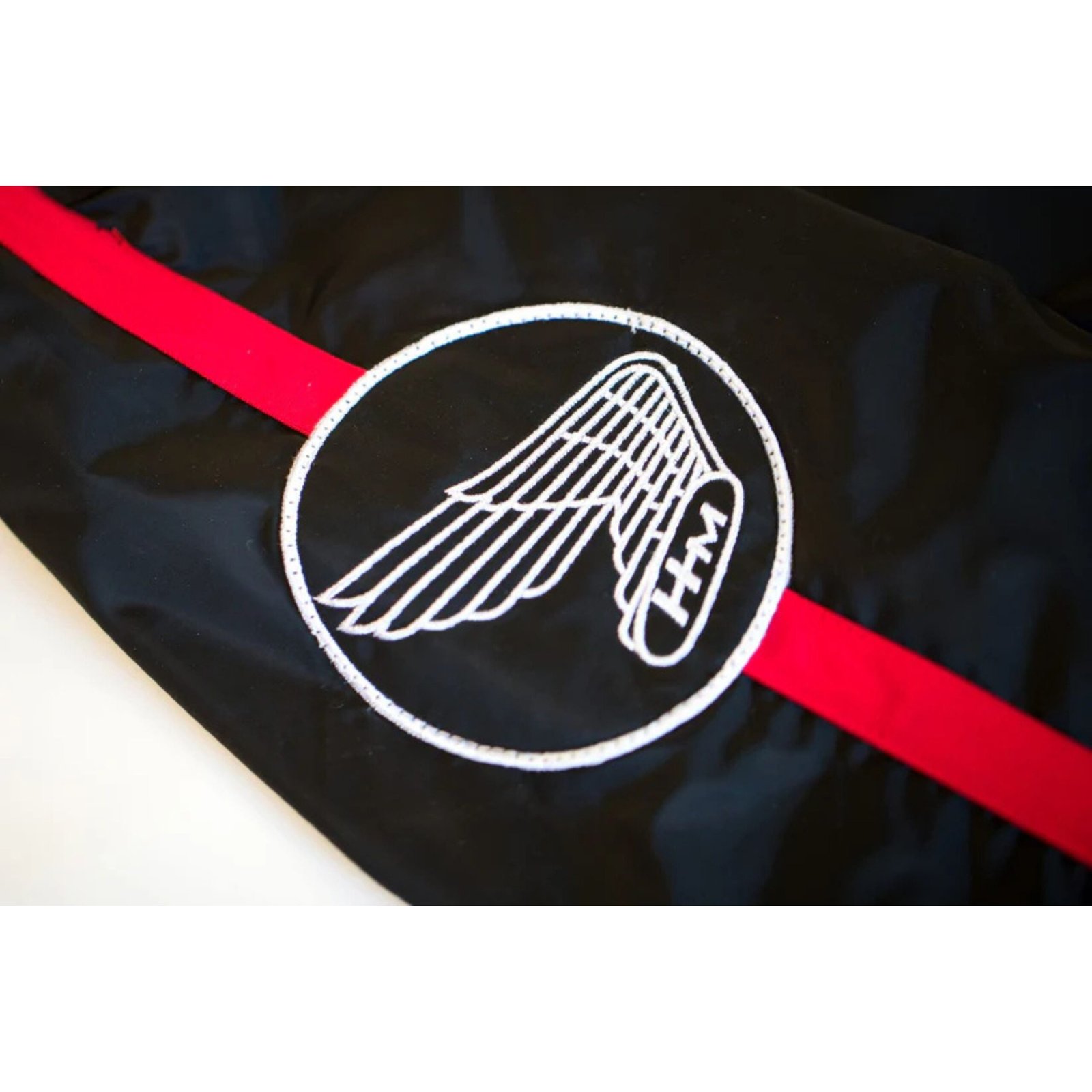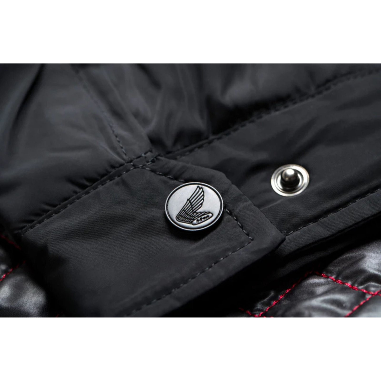 Constructed in black with bold red shoulder stripes and accented with red and white embroidery, this jacket features a lightweight, water-resistant exterior, ideal for year-round wear. Inside, a soft lining with contrast diamond stitching ensures comfort, while woven labels, embroidered vintage branding, custom zipper pulls, and buttons add refined, heritage-inspired details that showcase meticulous craftsmanship.