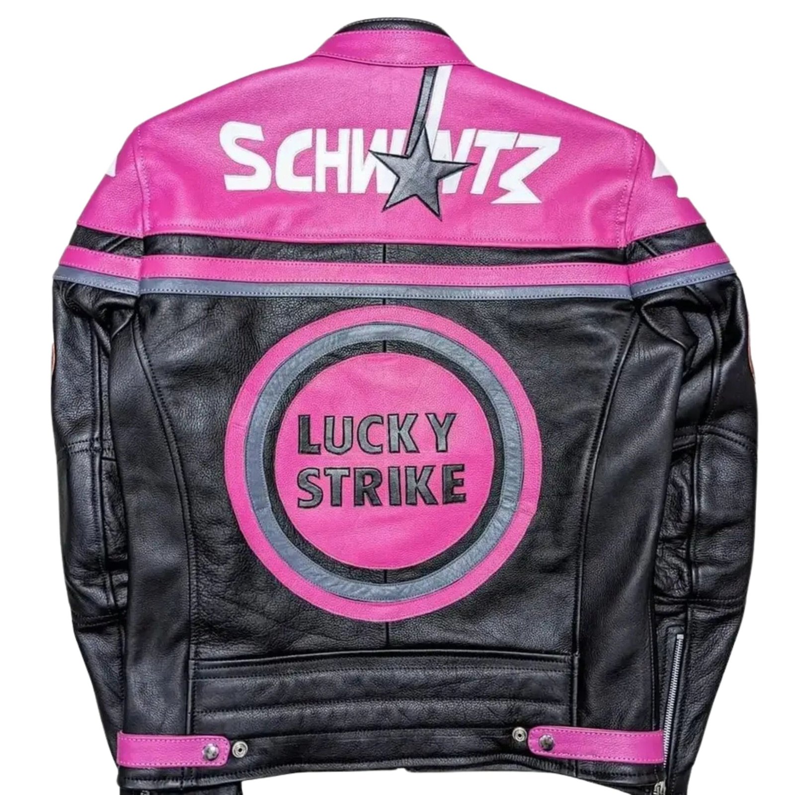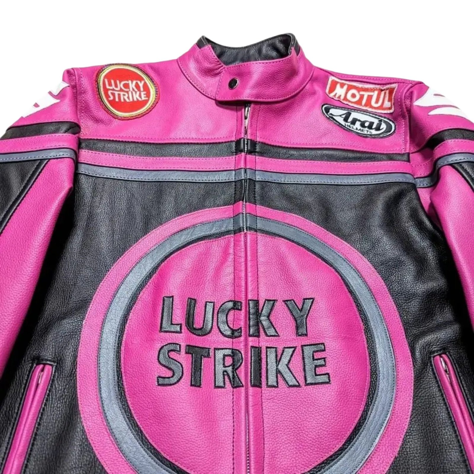 NARSON LUCKY STRIKE RACING MOTORCYCLE PINK AS BLACK LEATHER BIKER JACKET