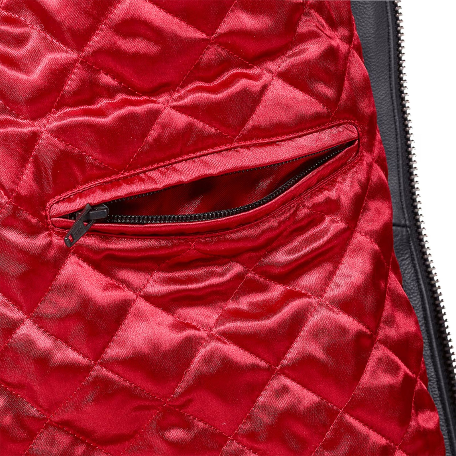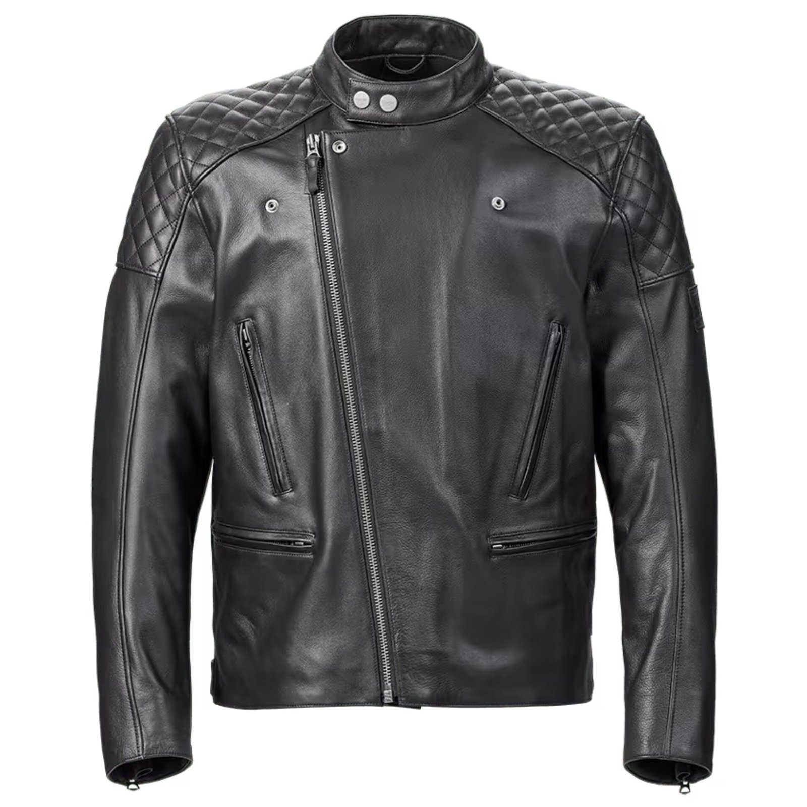 The jacket features an asymmetric zip closure, designed not only for aesthetic appeal but also for functionality. This angled zip enhances the overall fit, creating a streamlined front profile while allowing for easy layering and secure fastening during rides. The asymmetric design adds a modern edge to a classic leather jacket style, bridging traditional craftsmanship with contemporary fashion sensibilities.