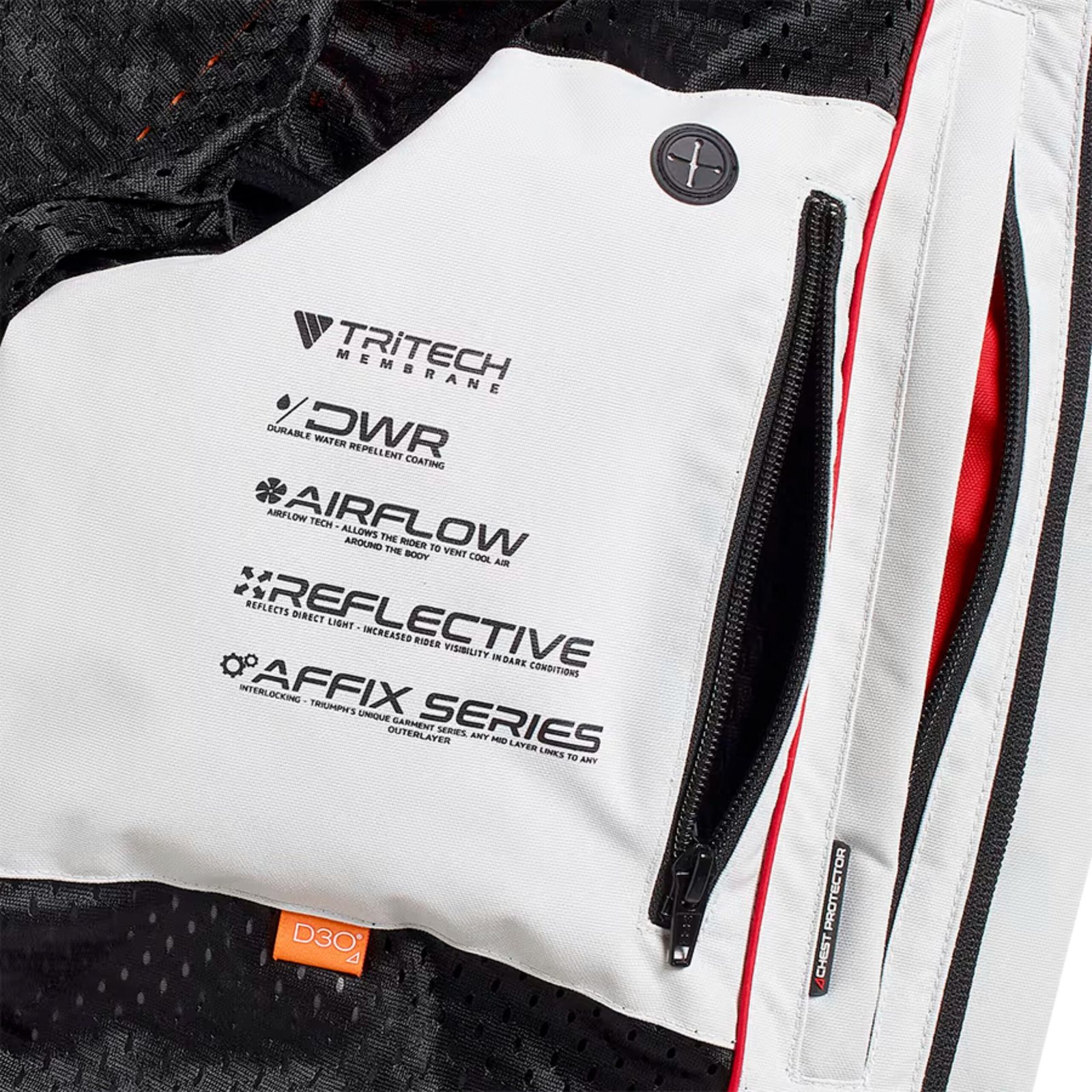 As part of Triumph’s exclusive Affix Series, the Adventure Jacket is designed for seamless compatibility with other modular layers in the range. This allows riders to customize their gear according to climate or conditions, creating the perfect layering system for year-round use. Whether you need additional insulation for colder rides or a lighter setup for warm weather, the Affix system ensures adaptability without compromising fit or performance.